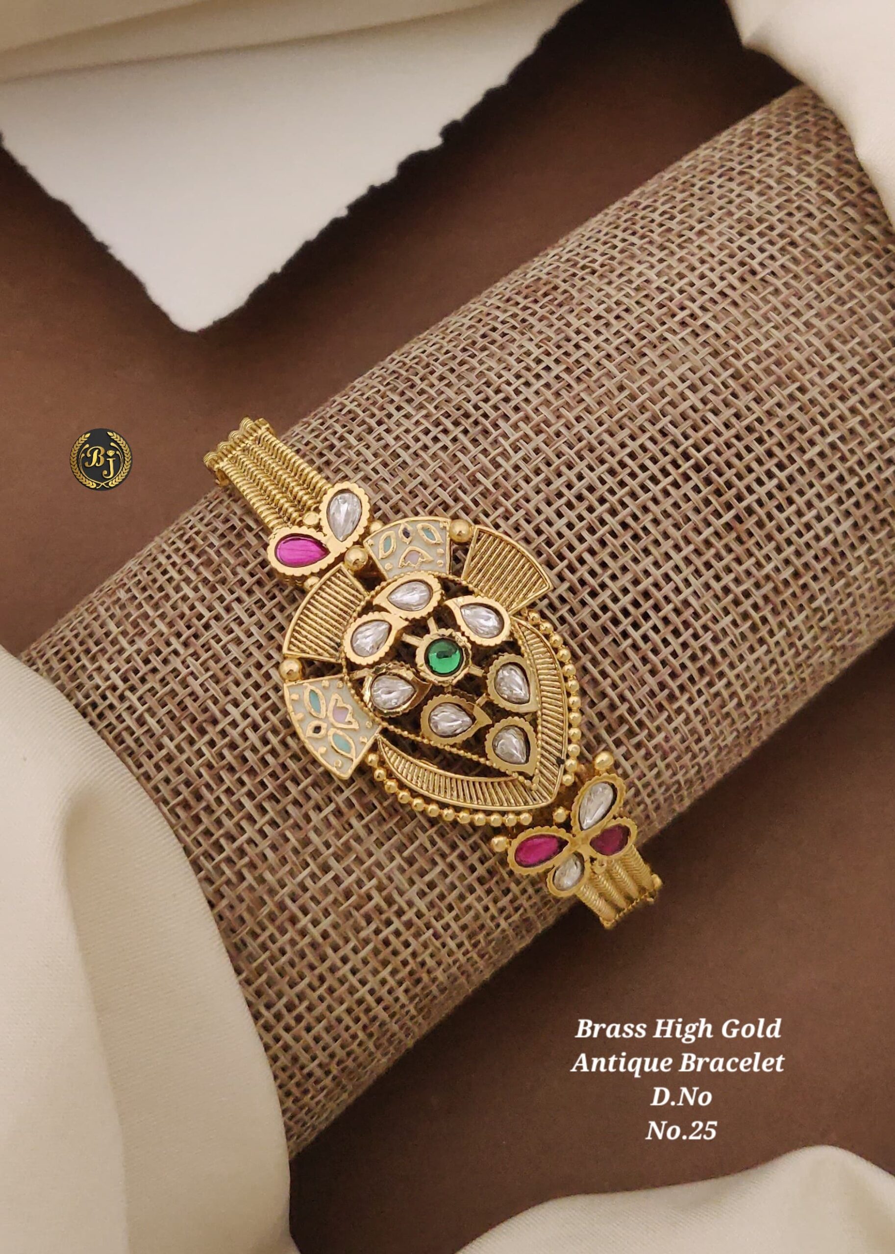 Elevate your ethnic charm with this exquisitely crafted Brass High Gold Antique Bracelet. Designed to reflect the richness of traditional Indian jewelry, this bracelet features an intricate floral motif with delicate pink and green accents. The centerpiece showcases a round enamel design with a vivid green stone surrounded by shimmering white AD stones, creating a beautiful focal point.